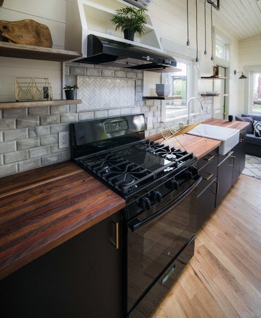 The counters are made of black walnut and African mahogany, while the flooring is solid hardwood oak. The home also features floating black walnut shelves and a dining table. The kitchen is fitted with a four-burner stovetop with a beveled marble splashback and a 24-inch ceramic farmhouse sink. The split system AC unit is also installed here.