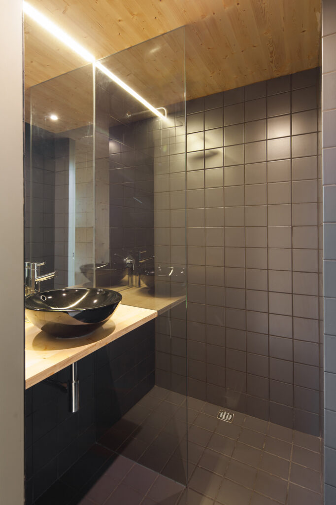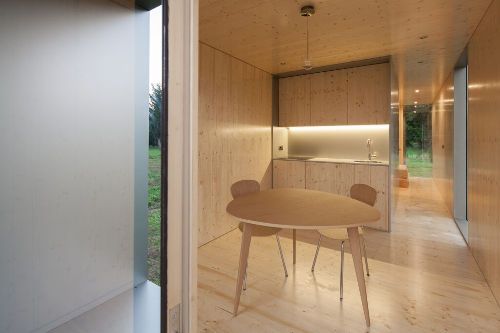 The home features plenty of glazing, which lets in ample amounts of natural daylight and makes it appear more spacious as a result. Aluminum was used for exterior cladding, and there is a laminated glazed area in the middle of the rectangular home. The walls are made up of CLT panels, insulation, and a layer of lacquered wood, which adds that extra bit of coziness to the home.