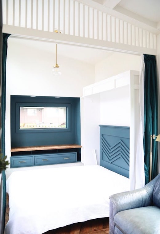 One of the bedrooms is also located on the ground level, next to the living room. It features a folding oak dining table, which can be folded out of the way when not needed, so as to make room for the Murphy-style bed.